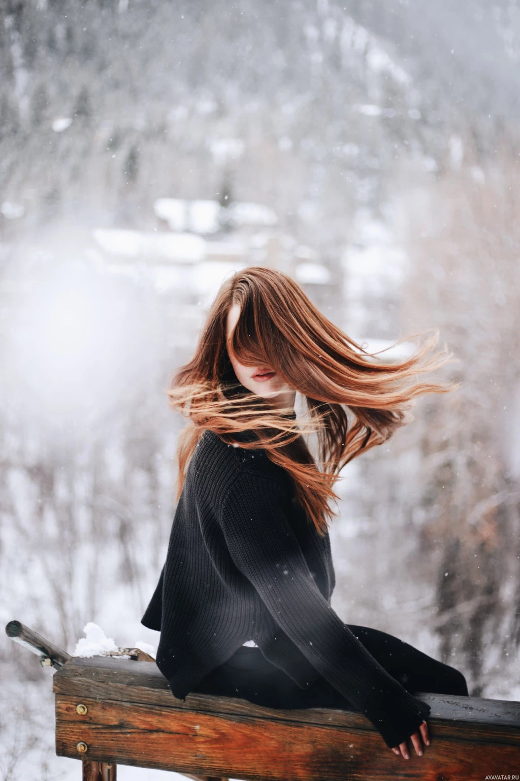 a black top and is looking off into the distance, which gives a sense of contemplation. The background suggests a wintry setting with