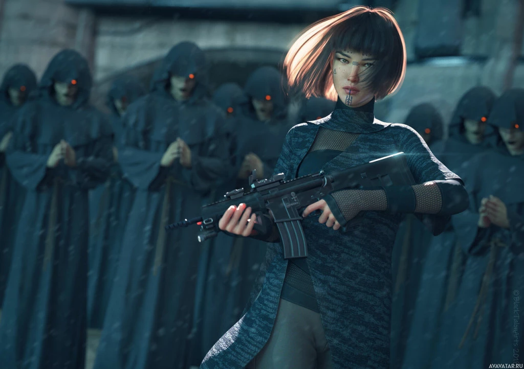 The image depicts a person holding a weapon, likely