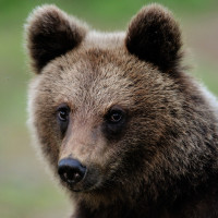 a brown bear with its head turned to the side. It appears to be in a natural,