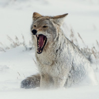 a snowy environment. It appears to be yawning, showing its teeth and tongue, which is a behavior sometimes interpreted as if the animal is yelling or expressing excitement. The setting looks like