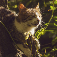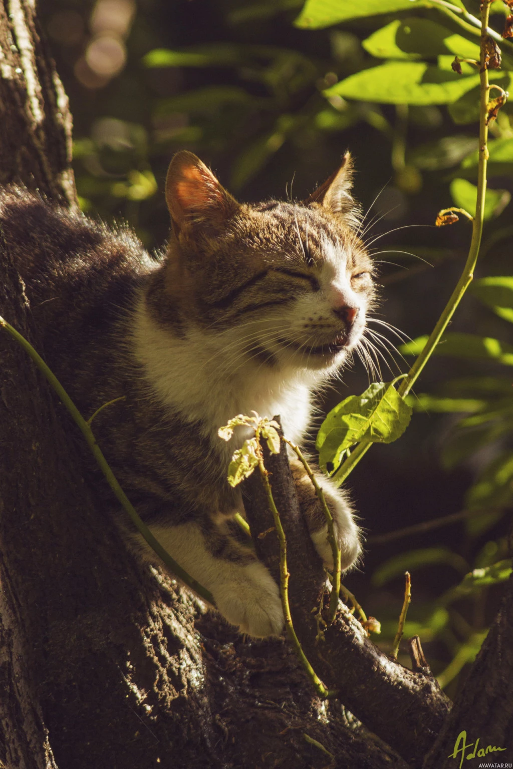 the branches of a tree. The cat appears to be relaxed and comfortable in its