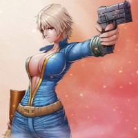 blonde hair, is wearing a blue vest with armor straps and a gun belt on her waist. In one hand, she holds a pistol pointed towards the viewer, while in the other hand, she holds another weapon. There's a red and orange glow or smoke behind her, which adds to