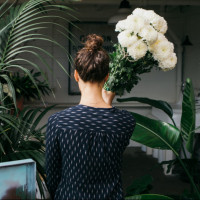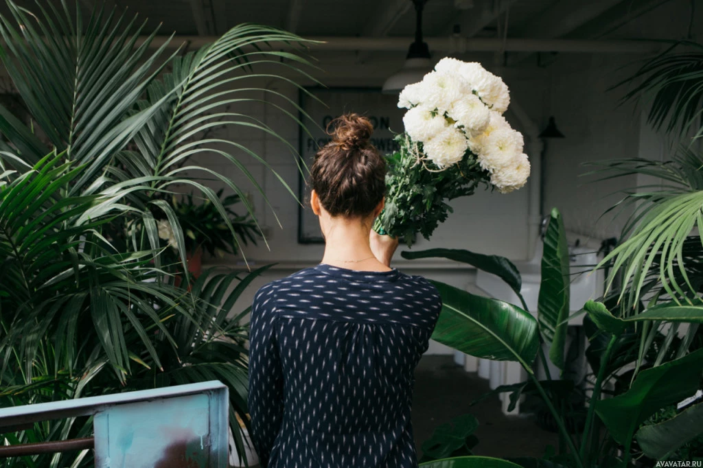 The image shows a person from behind, holding a bouquet of