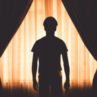 a silhouette of a person standing in front of what appears to be a window or curtained area. The lighting casts