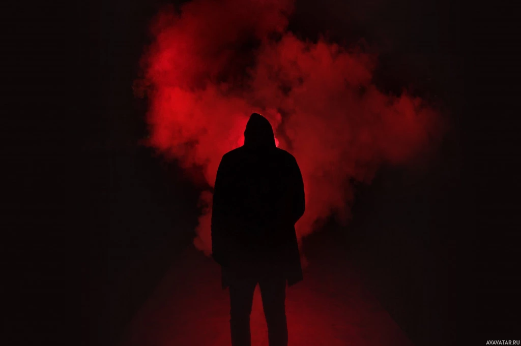 На картинке изображен силуэт человека, стоящего среди красного дыма или тумана, создающего впечатление загадочной или драматической сцены. Это можно интерпретировать как представление таких тем, как изоляция, опасность или момент размышления.