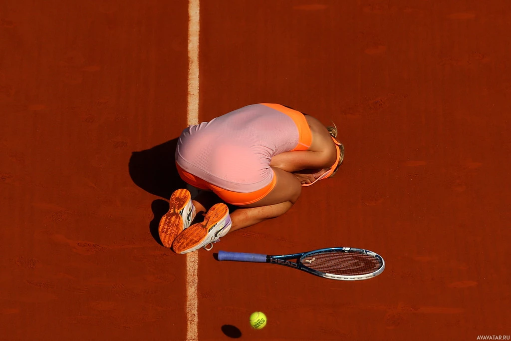 a tennis ball near her. This scene suggests that she may have lost an important point or match, given her posture and