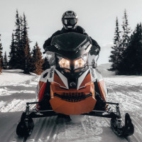 The image shows a person sitting on a snowmobile, also known as a skidoo or sled, which is used for winter recreational activities and transportation in
