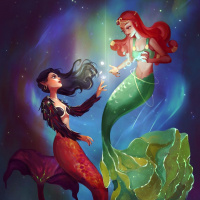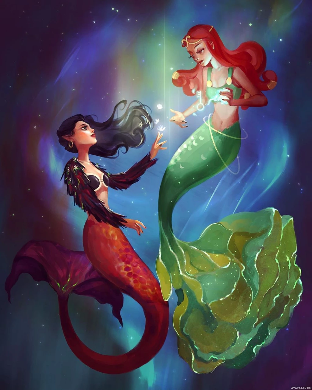a magical interaction. One mermaid is standing upright, appearing more human-like, while the other is swimming horizontally with her