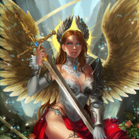 an illustrated character who appears to be a female angel. She is depicted with wings, and her attire includes