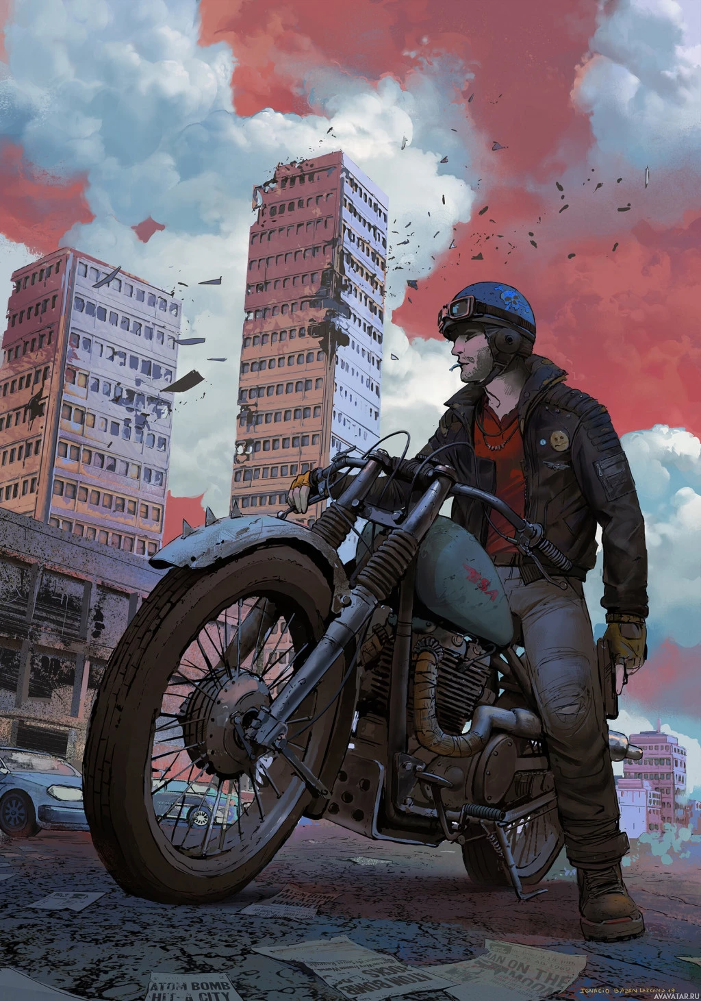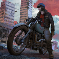 protective gear, including a helmet and what appears to be a leather jacket or riding suit with reflective material on it. The setting looks like a post-apocalyptic cityscape, with