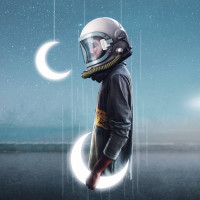 a dark sky with stars visible, and the atmosphere suggests a futuristic or science fiction theme. The astronaut appears to be in