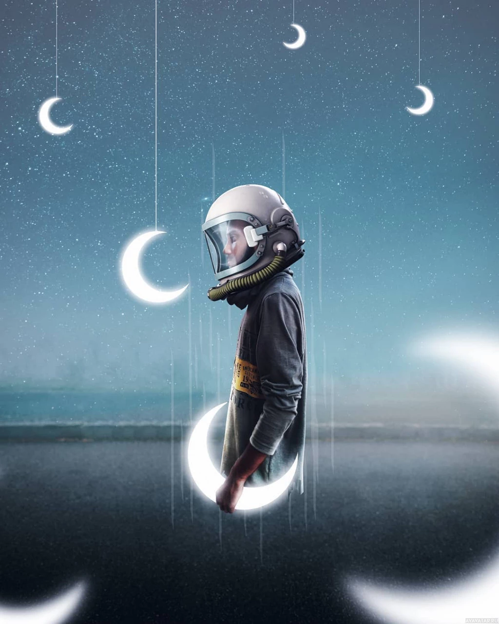 This image features an astronaut floating in space, surrounded by numerous moons. The background is