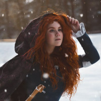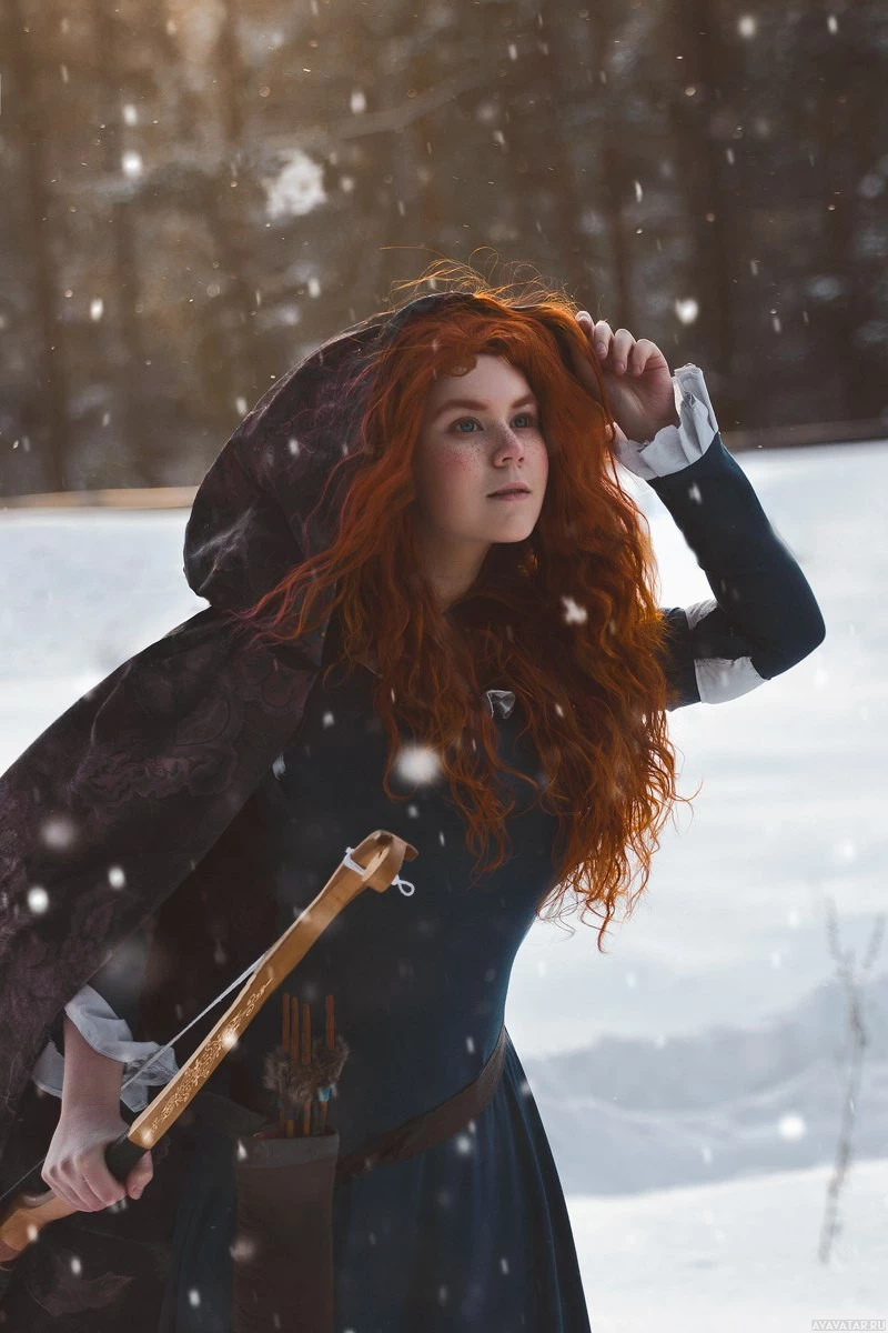 red hair styled into twists and braids, wears a cloak with hood and fastens it around her shoulders, and holds a bow. The background shows a wintry scene with snow falling and trees that suggest