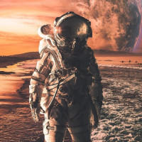 The image features an astronaut standing on what appears to be a distant planet or moon, with a large