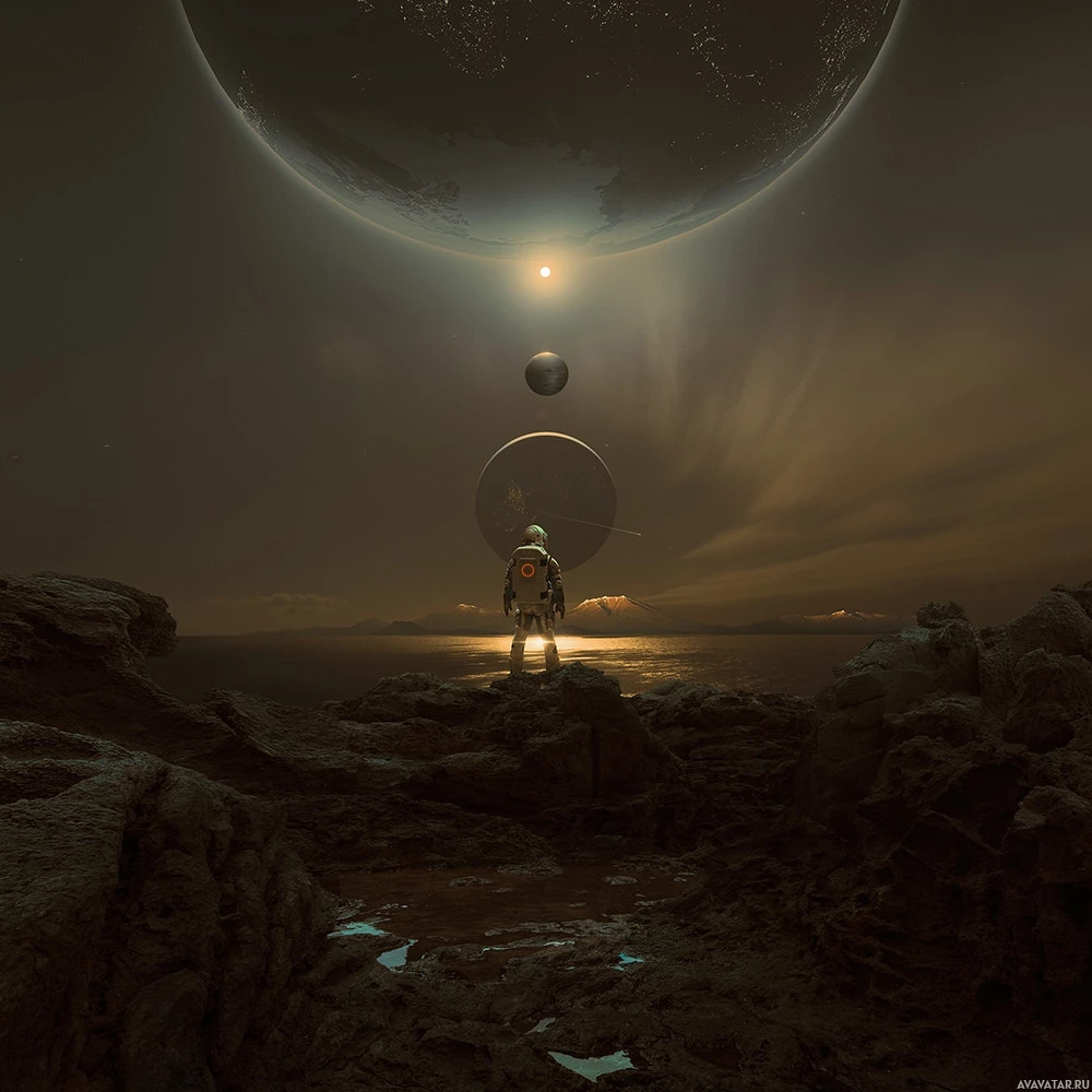 a sense of isolation and exploration, with the astronaut as the central figure looking out towards the cosmos.