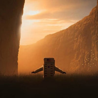 a vast expanse of the Martian landscape under a sunset or sunrise sky. The lighting suggests it's either
