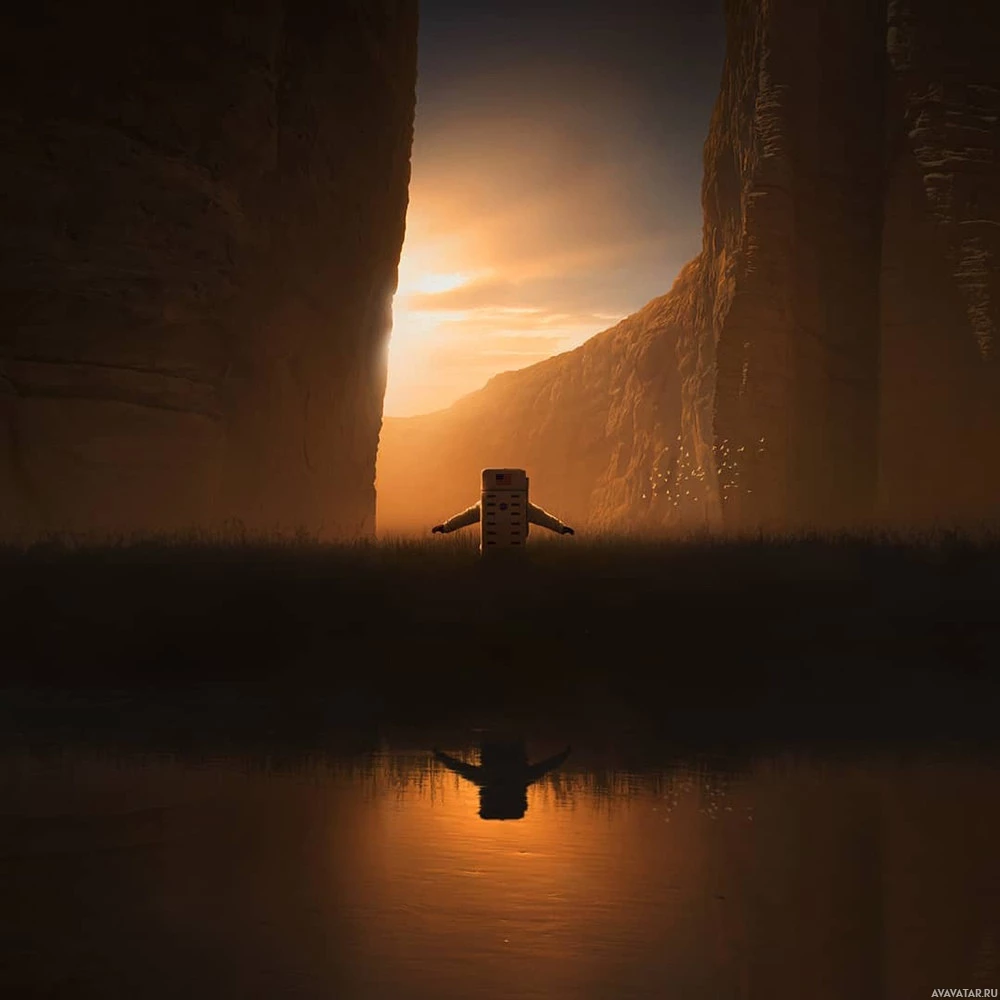 the Martian surface. In this scene, there is an astronaut standing in the center foreground facing away from the camera, looking out at
