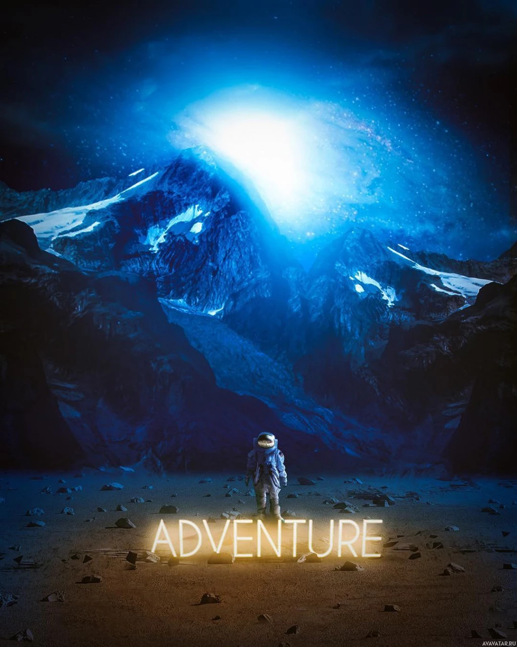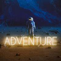 mountain range and a celestial body that resembles Jupiter with its moons visible around it. There is also text overlaying the image that reads "ADVENTURE". The overall style of the picture is surreal and artistic, suggesting themes of exploration or science