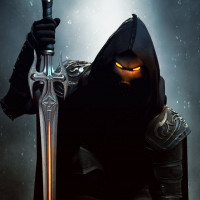 a video game or story, holding what seems to be a sword. This person is wearing a hood and has