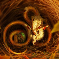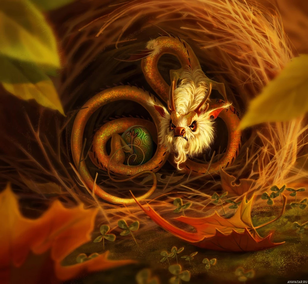 a fantasy dragon nestled in a nest surrounded by autumn leaves. There is an egg visible near the dragon, which might suggest that it is guarding its offspring or preparing to