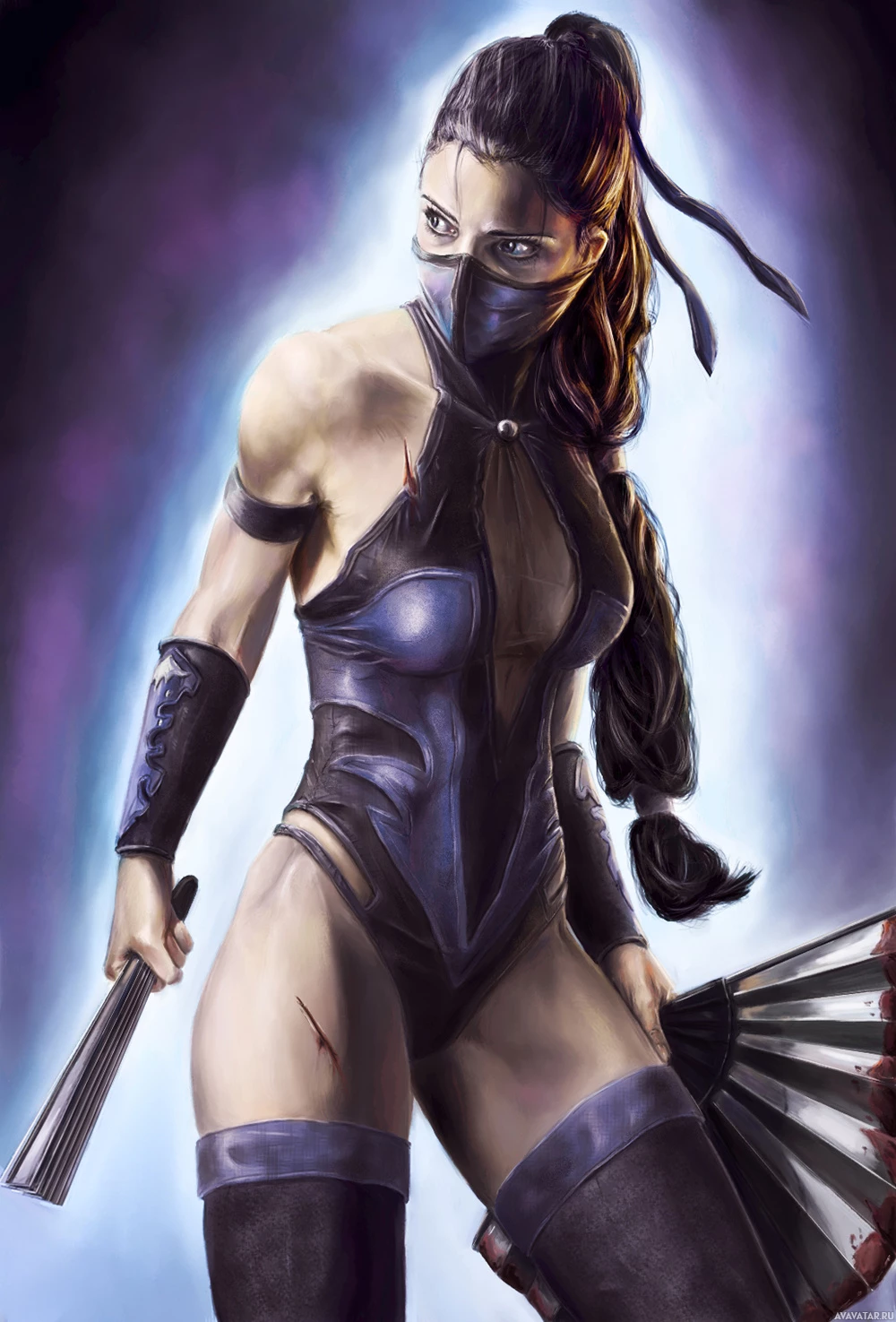 a leather outfit with thigh-high boots and wristbands, while holding what appears to be a pair of bladed fans in each hand. Her long