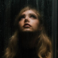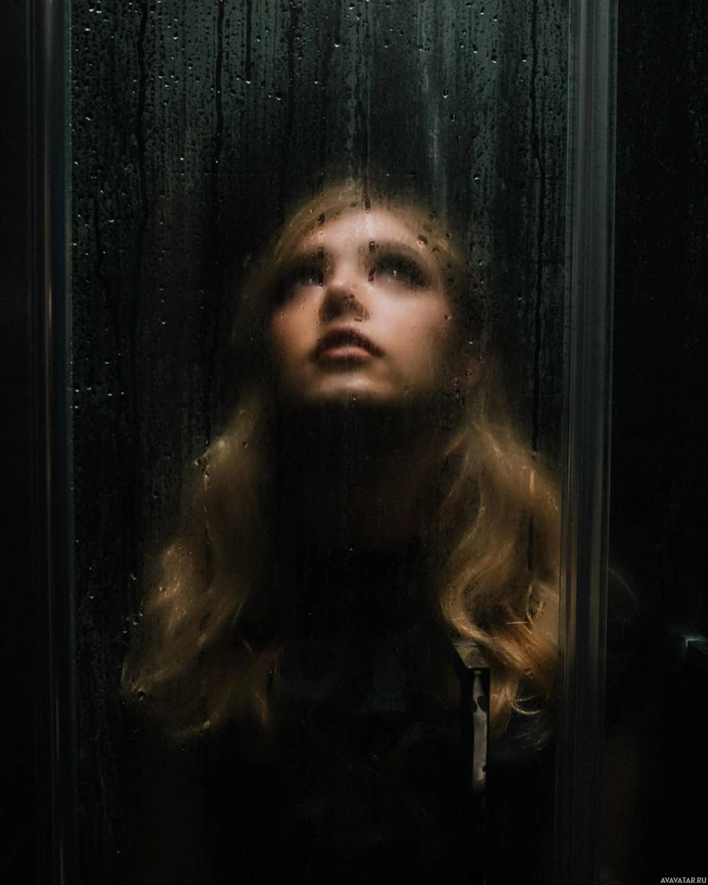 На картинке изображена молодая женщина со светлыми волосами, которая смотрит через окна, которые, кажется, пропитаны дождем. Ее выражение созерцательно или обеспокоено, когда она смотрит.