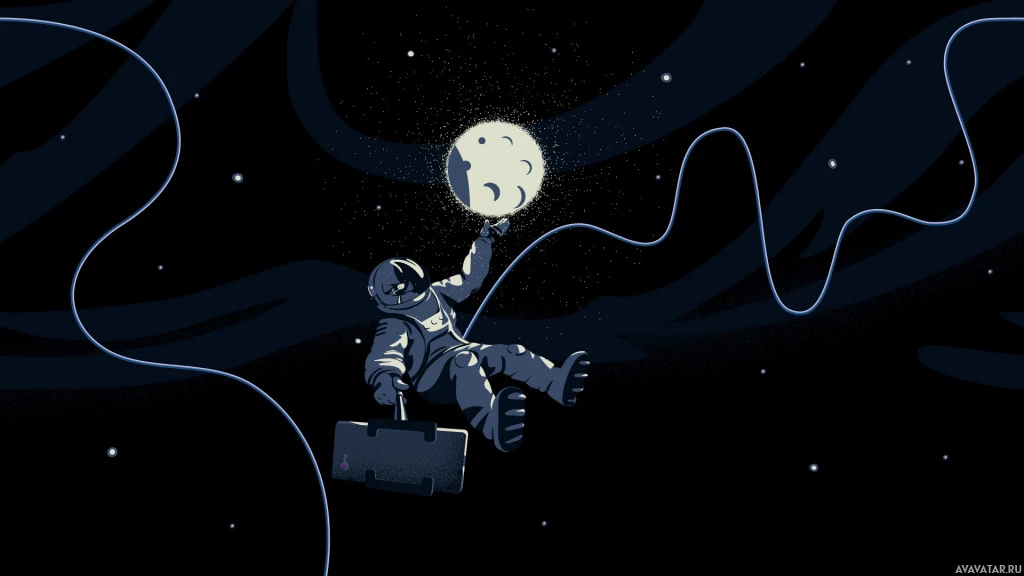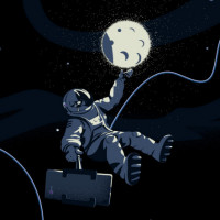 a space suit holding onto what appears to be a celestial body, possibly the moon or another planet, while floating in outer space. The background features