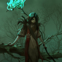 fantasy attire, with tattered edges and a cloak draped over her shoulders, adding to the mystical ambiance. The background is dark and moody, which could indicate