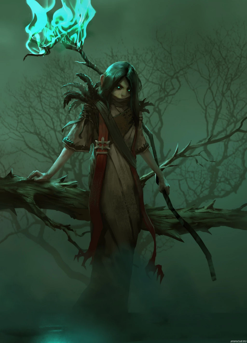 The image depicts a fantasy-themed character. She appears to be a female with long