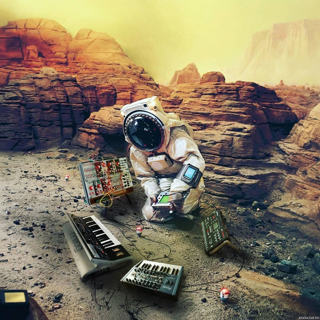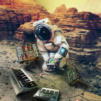 sheet music. The scene suggests a futuristic or speculative scenario where an astronaut is engaged in composing music while being on a mission to Mars.