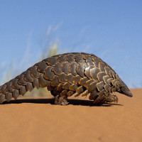 The image shows an animal known as a pangolin. Pangolins are mammals of the order Pholidota, native to sub-Saharan Africa and parts of Asia. They have thick, hardened scales that cover their body for protection against predators. The pangolin in this picture appears to be walking across a sandy or