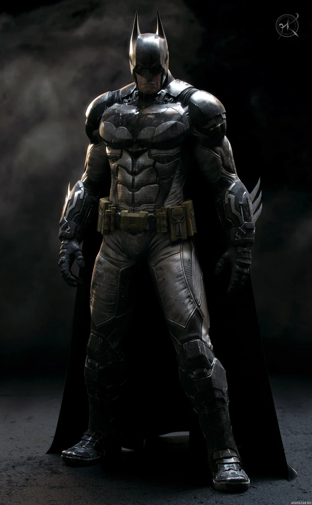 iconic costume, which includes a black cowl, cape, emblem on his chest, and a utility belt with gadgets. He is standing in
