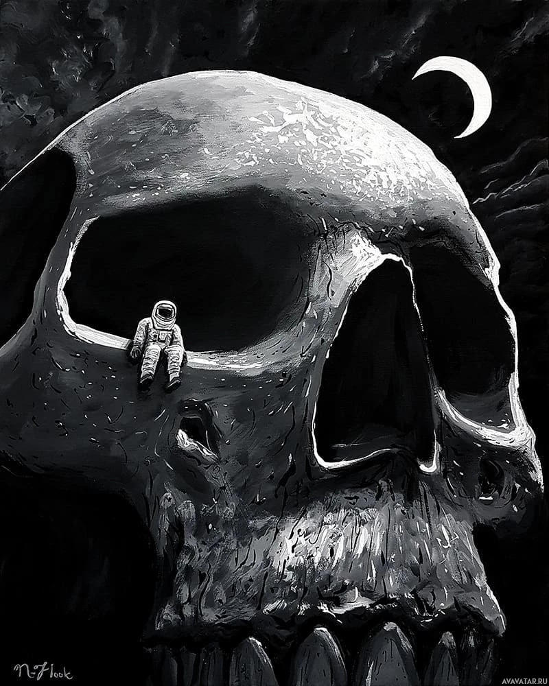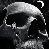 the eye socket. This artistic representation combines elements of death and space exploration, possibly symbolizing humanity's curiosity about the unknown or its quest for knowledge that might lead to self-discovery or self-realization. The