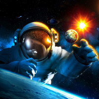 a backdrop of the Earth, Sun, and planets. The astronaut is wearing
