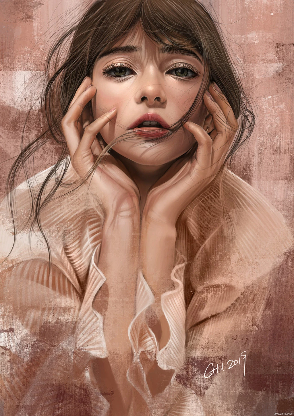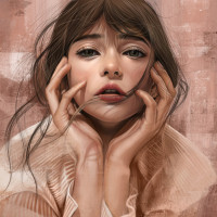 a slight frown on her lips. Her hair is long and it seems to be blowing in the wind as indicated by the strands falling around her cheek. The background is softly blurred, which focuses attention on her face. The overall style of the image suggests a modern, artistic approach to portraiture with