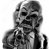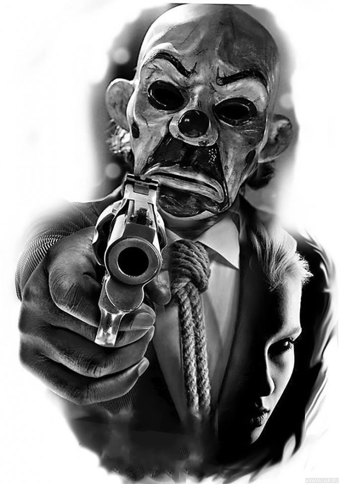 The image shows a character holding a pistol and pointing it towards the viewer. The character is wearing a mask that resembles a clown, complete with exaggerated features such as a large nose,