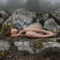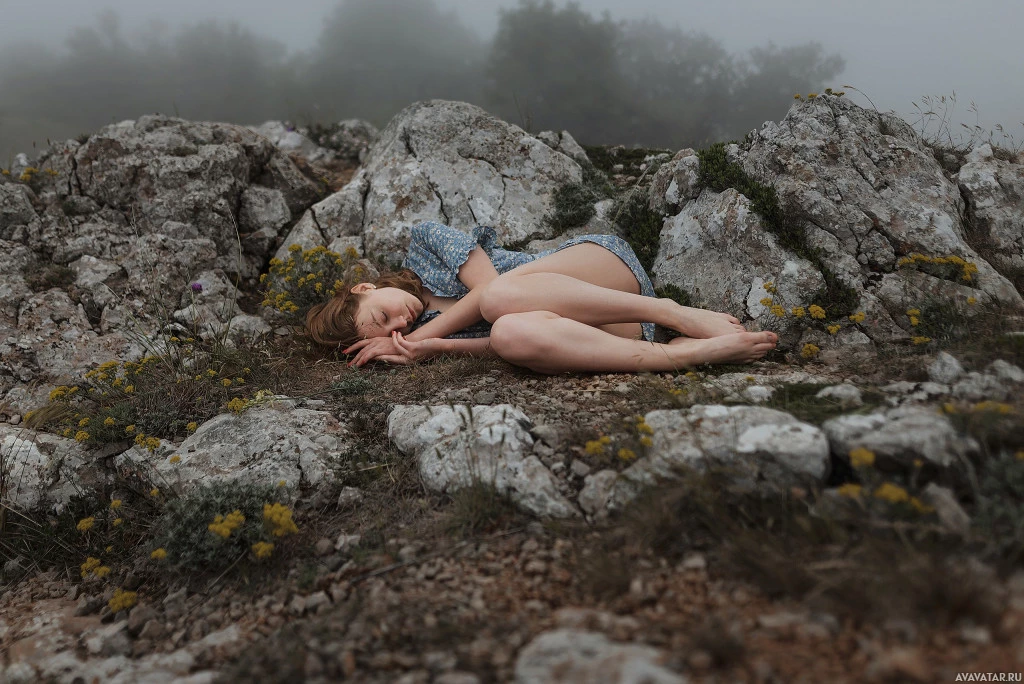 a natural setting, surrounded by rocks and vegetation. The individual appears to be sleeping or resting peacefully. It is