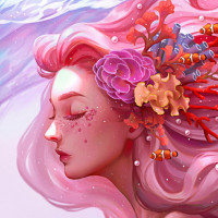 looking hair. There are various types of fish swimming among the strands of her hair, adding to