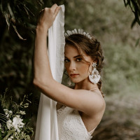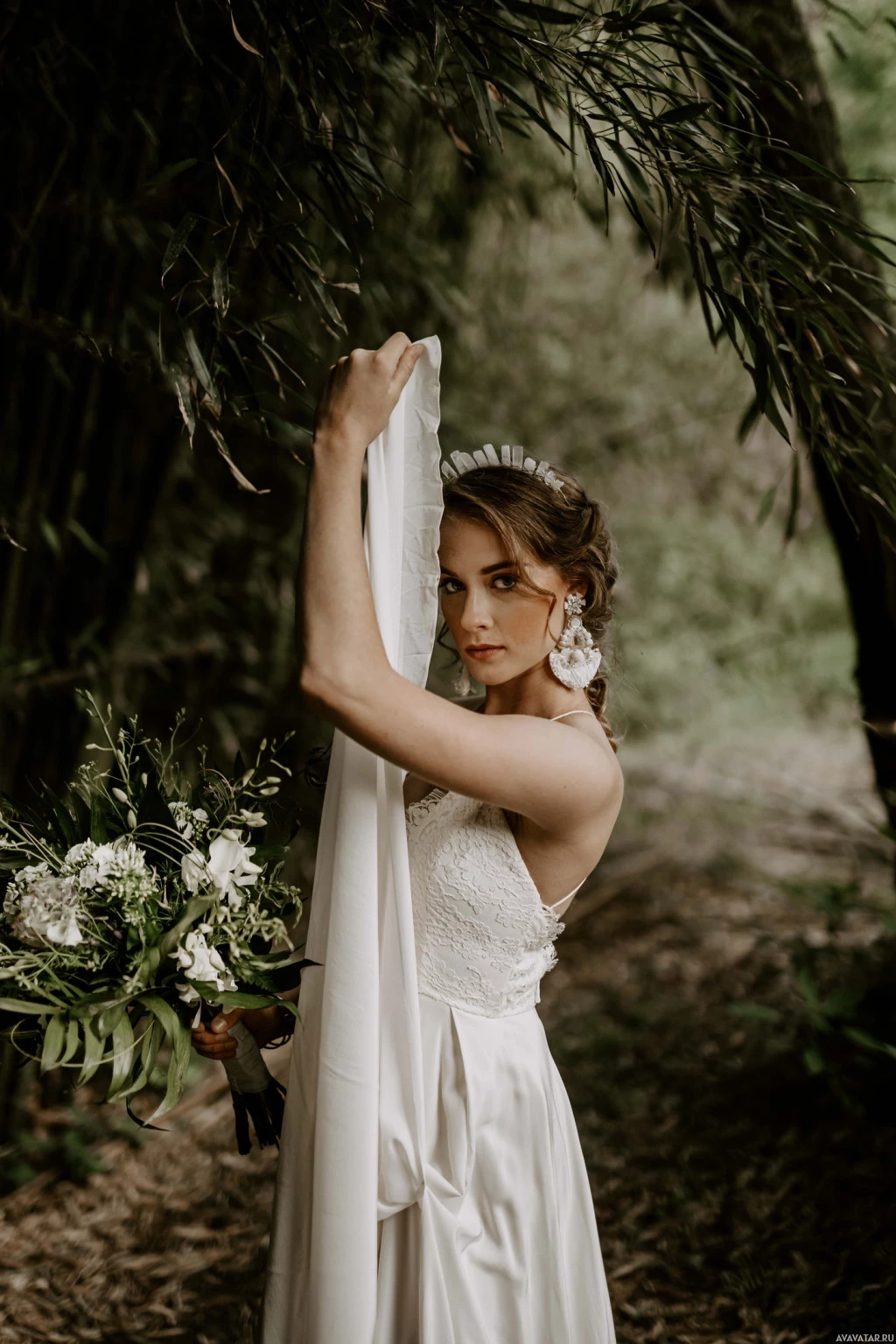 a bouquet of flowers and has her hands placed on either side of what seems to be a veil or another piece of fabric. The setting looks like a natural