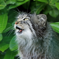 The image shows a tabby cat with long fur, which is characteristic of the breed known as the Maine Coon. This cat appears to be sitting in a natural environment surrounded by green foliage and possibly a river or stream behind it. The cat's expression suggests that it may be vocalizing or reacting to something out of frame.