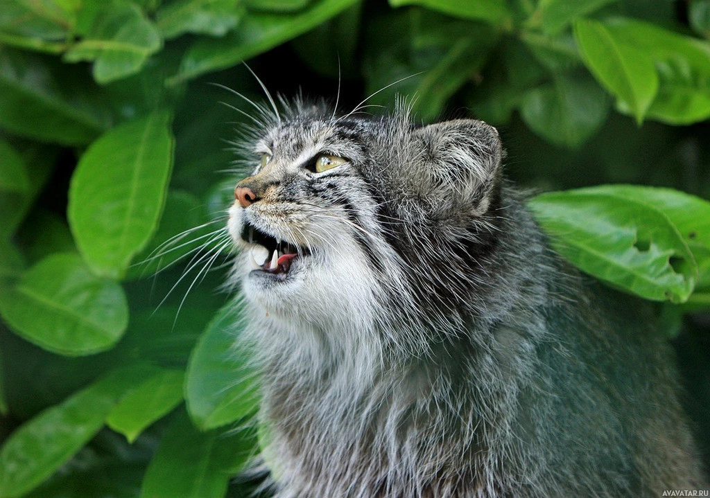 На картинке изображена ленточная кошка с длинным мехом, что характерно для породы, известной как мейн-кун. Эта кошка сидит в естественной среде, окруженной зеленой листвой и, возможно, рекой или ручьем за ней. Выражение кошки предполагает, что она может вокализировать или реагировать на что-то вне кадра.