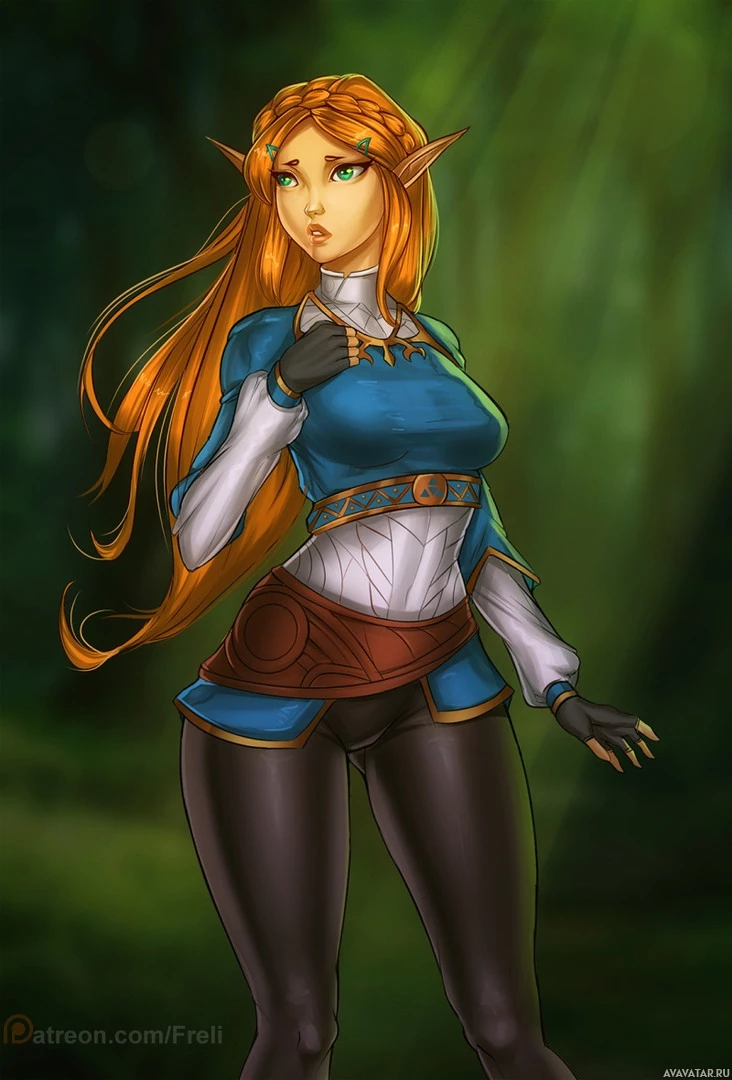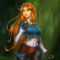 blonde hair, green eyes, and is dressed in an outfit that resembles the attire of a fantasy elf or a character from the "Zelda" series, which includes a sleeveless top with leather accents and a bow on her back. The background suggests