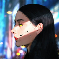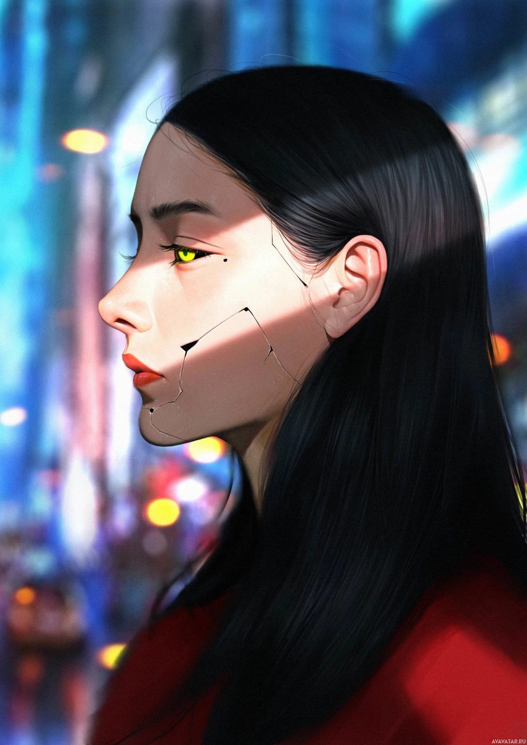 an urban setting, with buildings that could imply a cityscape. There's a light source from the left side of the image illuminating her face and the right side of the image is in shadow.