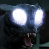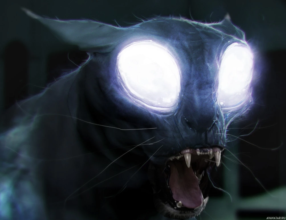 intense emotion. There are glowing eyes, which is not typical for cats, indicating a supernatural element. The creature is set against what looks like an indoor environment with dark tones and