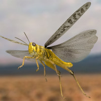 The image depicts a grasshopper flying in the air. It has distinct yellow and black coloration, with visible wings and antennae that are characteristic of grasshoppers. The background suggests a desert-like environment.