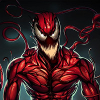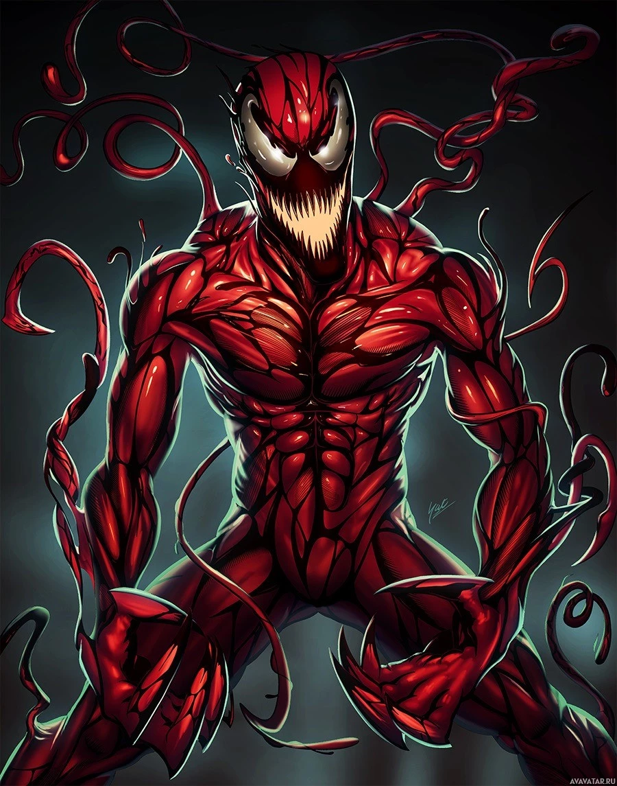 The image depicts a character known as Carnage, who is an antagonist from the Spider-
