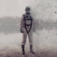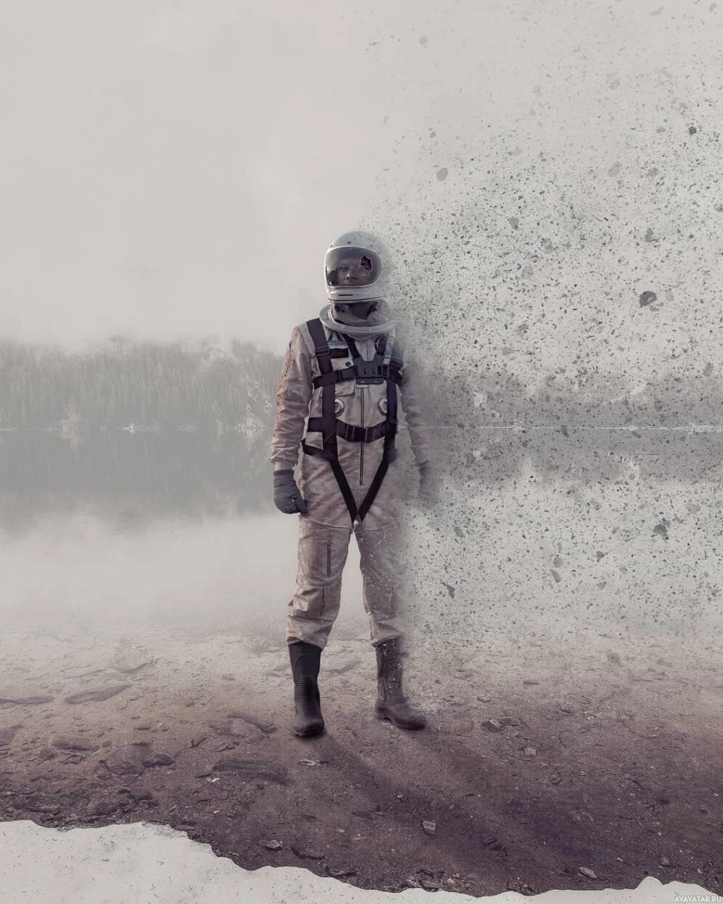 a space suit and has his hands resting on his hips as he looks out towards the water, possibly reflecting on his experiences or preparing for a mission.