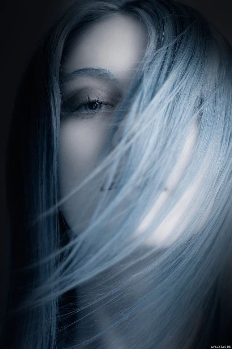 dark eyelashes. Her hair seems to be in motion as if it's being blown by the wind or a fan. The background is neutral and does not contain any