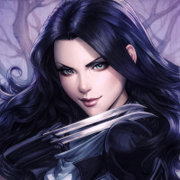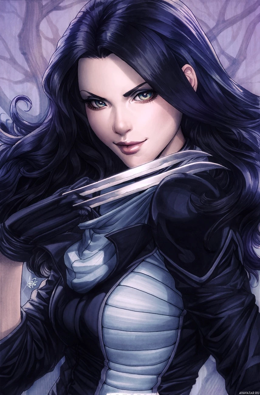 The image depicts a character known as X-23 from the comics associated with the "X-Men" franchise. She is portrayed in her