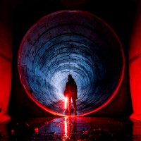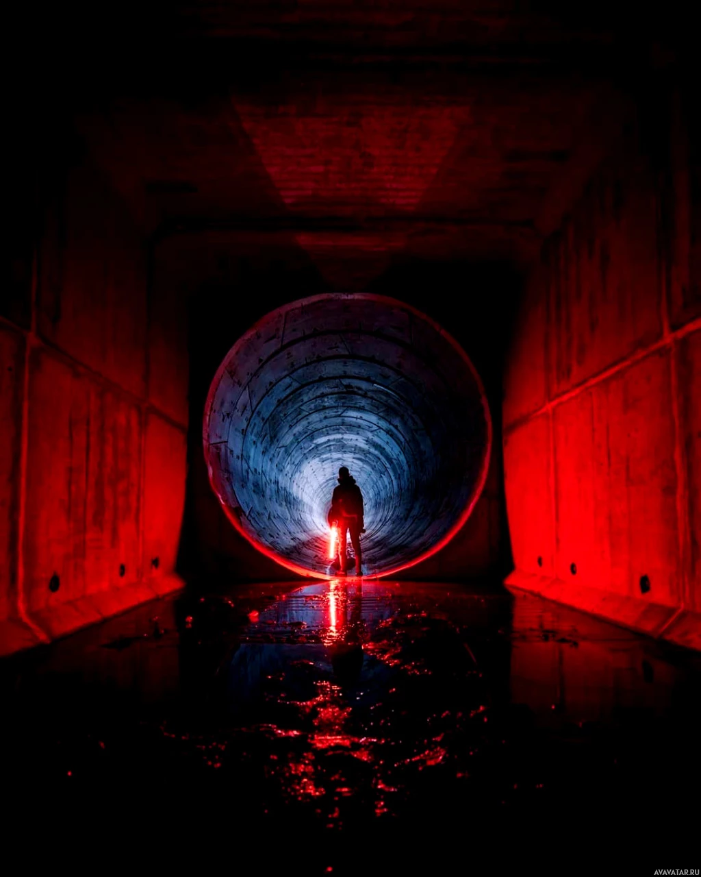 the dark figure and the glowing exit creates a striking visual effect that emphasizes depth and isolation. There is water on the ground, indicating
